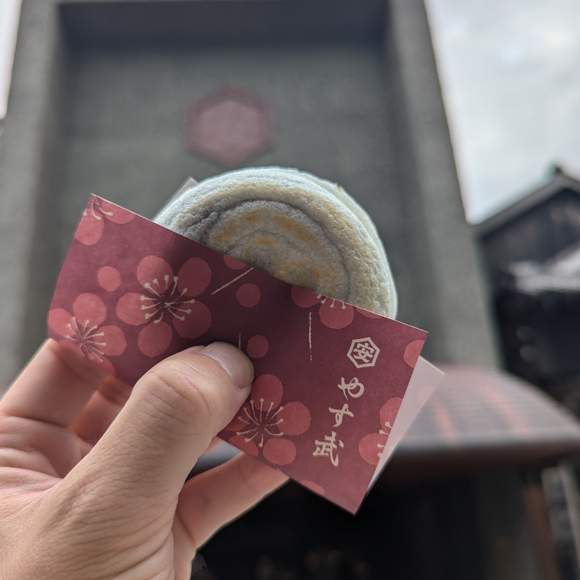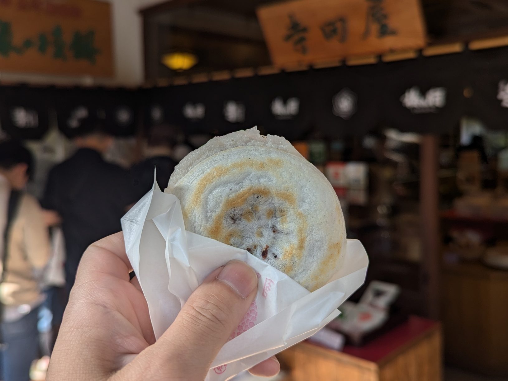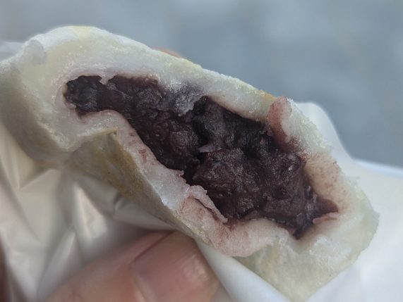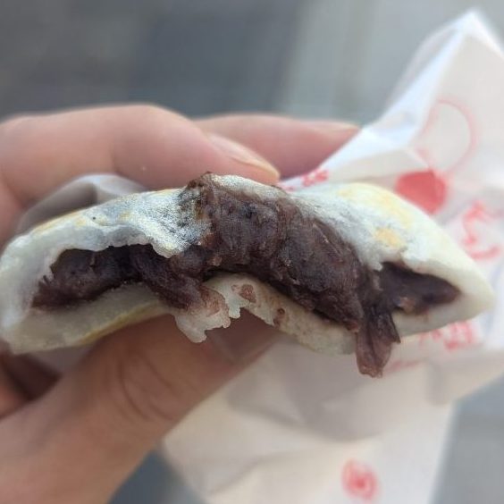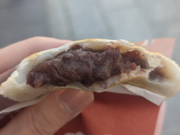 中に入ると、もっちりとした食感が口の中に広がります。この対照的な食感のコントラストが、梅ヶ枝餅の魅力を一層引き立てています。