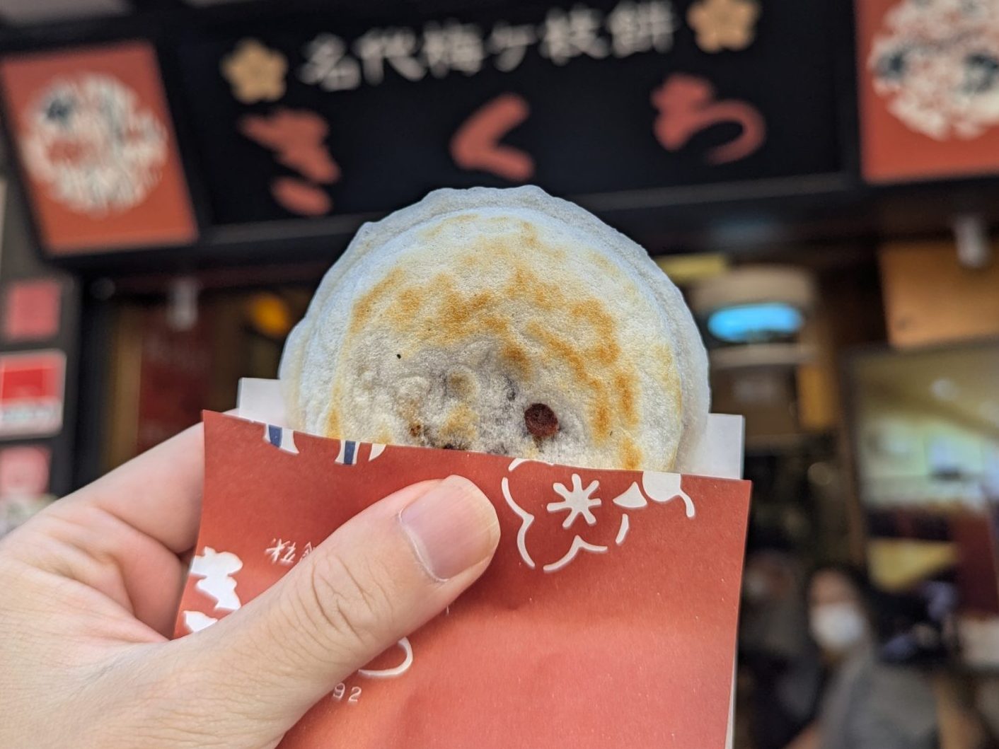 香ばしい香りを漂わせる表面は、パリパリとした食感が心地よく、かじった瞬間に梅ヶ枝餅の風味が口いっぱいに広がります。